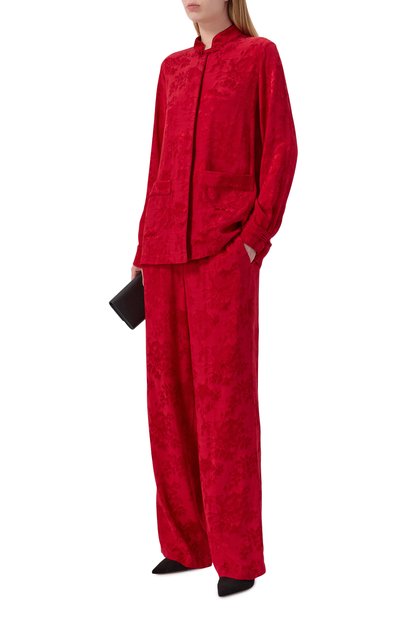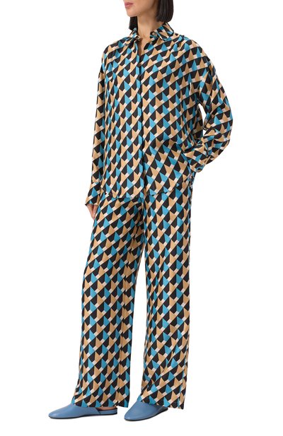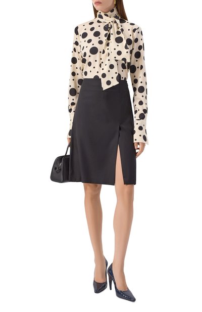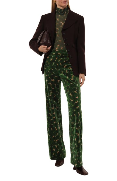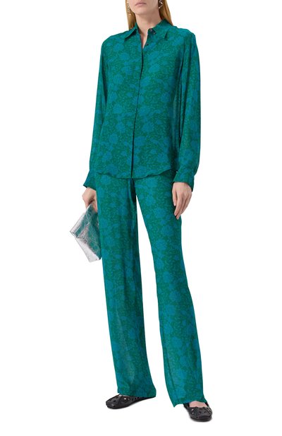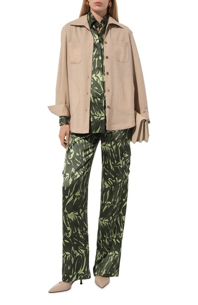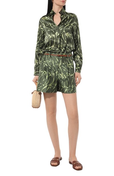 Блуза работы неаполитанских портных станет главной в непринужденном образе с кожаными шортами, босоножками и сумкой. Модель с отложным воротником, длинными рукавами и бантовой складкой на спинке выполнили из тонкого шелкового атласа с растительным принтом в зеленых тонах. Пуговицы из благородного австралийского перламутра Pinctada Maxima скрыли планкой.