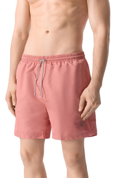 Плавки-шорты насыщенного розового оттенка сшили из легкого гладкого полиэстера с повторяющимся принтом в виде фирменного логотипа. Быстросохнущее изделие с двумя люверсами, пропускающими воду, дополнили четырьмя карманами: двумя врезными боковыми и двумя с клапанами, украшенными фирменными эмалевыми кнопками. За комфортную посадку на талии отвечает эластичный пояс-кулиска.