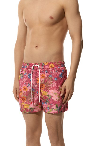 Для пошива терракотовых шортов с абстрактным принтом использовали легкий шелковистый полиэстер, который быстро высыхает после плавания и долго сохраняет первоначальный вид, не выцветая под палящим солнцем. Модель с эластичным поясом-кулиской, регулирующим посадку, дополнили спереди и сзади накладными карманами с символикой марки.