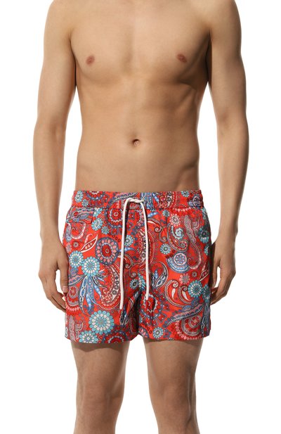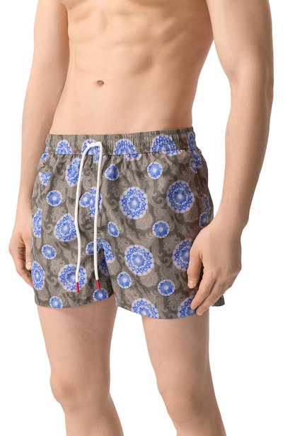 Неоднородный серый оттенок придает плавкам-шортам из прочного полиэстера сходство с льняной одеждой, а голубые и красные цветы добавляют ярких красок. Палитру поддерживает алая кнопка на правом боковом кармане, а клапан заднего украшает белый логотип марки. Сзади под эластичным поясом-кулиской – два люверса.