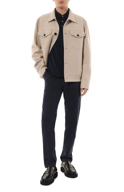 Темно-синие чиносы подружатся и с повседневной одеждой, и с вещами для офиса с нестрогим дресс-кодом. Мастера неаполитанской марки вручную сшили модель из стрейчевого немнущегося твила, в составе которого соединили прочный хлопок ценных сортов и гладкий мягкий шелк. Брюки с прорезными боковыми и задними кармана ми украсили на одной из шлевок вышитым логотипом, продублировав декор на фирменном патче, украшающем пояс с эластичной вставкой.
