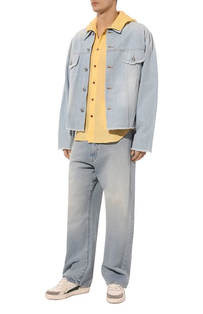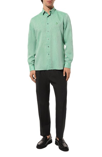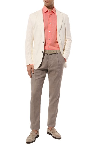 При создании розовой рубашки отложной воротник заменили на капюшон, придав ей сходство с худи. Ассоциацию усилили, расположив два втачных кармана по бокам. Модель с длинными рукавами сшили из тонкой льняной ткани, изготовленной на собственной суконной фабрике в Биелле — настоящей лаборатории, где непрерывно проводят ся эксперименты с видом и свойствами полотен. Изделие застегивается ярко-красными брендированными кнопками.