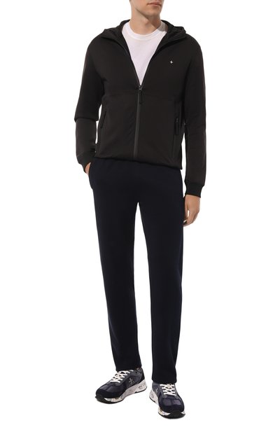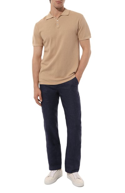 Темно-синие брюки с миниатюрной контрастной вышивкой в виде логотипа гармонично впишутся в повседневный образ с рубашкой или джемпером. Прямая модель комфортно садится на талии и не требует ремня за счет эластичной вставки на поясе сзади и патов — по бокам. Для пошива изделия с прорезными карманами использовали хлопковый габардин, обеспечивающий комфортный микроклимат.