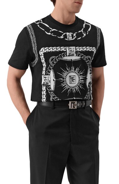 Пряжке этого ремня задала форму монограмма PB, созданная Пьером Бальманом под впечатлением от садовых лабиринтов эпохи Возрождения. С геометричной застежкой рифмуются квадратные люверсы, выполненные из такого же серебристого металла с зеркальным блеском. Акцентные детали контрастируют с черной телячьей кожей, отшлифованной до гладкости.