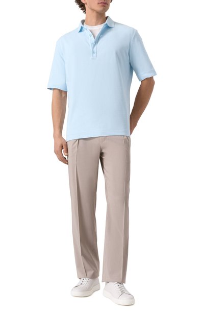 Голубое поло поможет составить комфортный повседневный образ. Для изготовления модели Донателла Версаче выбрала мягкое хлопковое пике, которое поддерживает оптимальный микроклимат, почти не мнется и не деформируется со временем. Отложной воротник декорировали белым рельефным логотипом Versace Nautical.