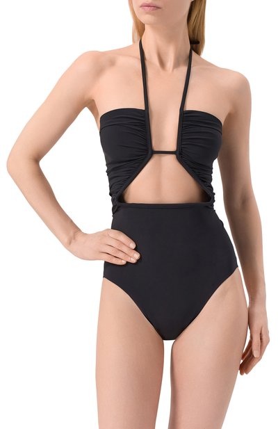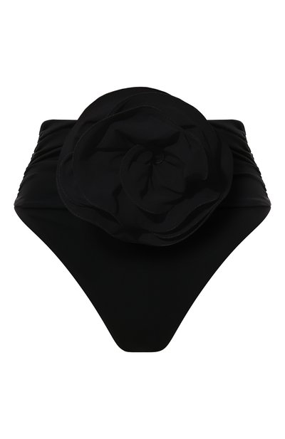 Черные плавки с завышенной посадкой, как у купальников в стиле ретро, выполнили из мягкой эластичной микрофибры. Шелковистый на ощупь материал хорошо тянется, поэтому модель комфортно облегает фигуру и не слетает даже при сильной волне. Широкий пояс, создающий деликатный утягивающий эффект, декорировали утрированно крупной аппликацией в виде цветочного бутона.