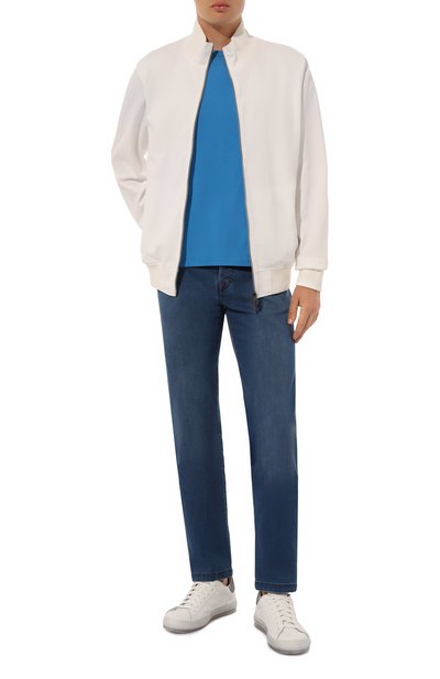 Голубую футболку из мягкого хлопкового джерси изготовили в рамках проекта #UseTheExisting™. Текстиль, оставшийся от предыдущих коллекций, бережно переработали с помощью инновационных технологических процессов, которые позволяют минимизировать отходы. Модель декорировали черным логотипом спереди и оранжевой лентой сзади.