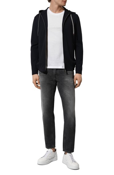 Для пошива темно-синей толстовки с глубоким регулируемым капюшоном использовали мягкий гладкий трикотаж из хлопка ценных сортов. Волокна у такого сырья особенно длинные, поэтому материал получился прочным, дышащим и приятным на ощупь. Лаконичная модель застегивается встречной молнией.
