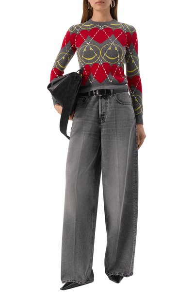 О принадлежности розового пуловера бренду напоминает фирменный смайл, который вписали в крупный орнамент аргайл. Эмблема марки повторяется и на миниатюрной нашивке, которой дополнили широкий пояс спереди. Модель со спущенной линией плеч и V-образным вырезом выполнили из мягкой отборной шерсти, укрепленной полиэстером.