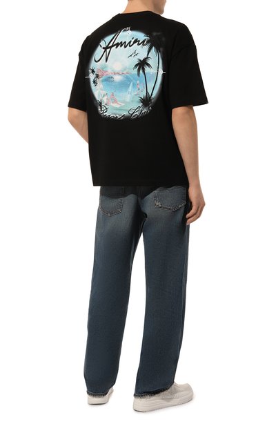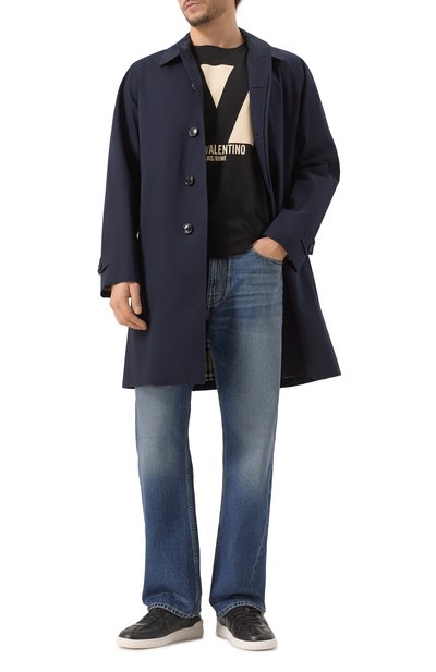 Черную футболку с круглым вырезом изготовили из гладкого хлопка ценных сортов. Мягкий эластичный трикотаж хорошо пропускает воздух, а изделие комфортно садится по фигуре, не ограничивая свободу движений. Принадлежность модели бренду обозначили крупным полосатым принтом с логотипом и эмблемой, выполненными в голубых и белых тонах.