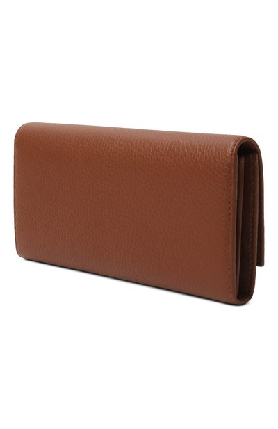 Бежевое портмоне сшили из мягкой прочной кожи с крупным зернением, подчеркнутым глянцевым блеском. Аксессуар с карманом для монет и отделением для купюр дополнили пятью слотами для кредитных карт. Модель, застегивающуюся на кнопку, декорировали тиснением.