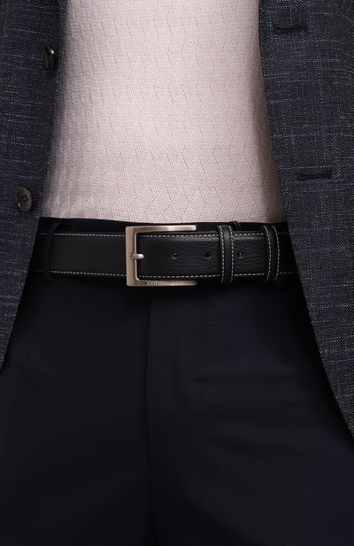 Лаконичный темно-синий ремень поддержит повседневные образы с джинсами или чиносами. Аксессуар выполнили из пластичной ворсовой шкуры теленка, которая слегка блестит на свету и не боится заломов. Изделия застегивается классической прямоугольной пр яжкой, которую украсили выгравированным логотипом бренда.