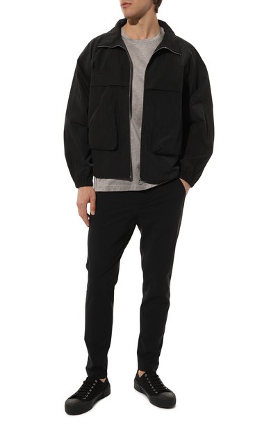Дизайнеры бренда, основанного Хуго Фердинандом Боссом, превратили черные брюки карго в джоггеры, дополнив их широкими трикотажными манжетами. Для пошива зауженной модели использовали габардин на основе прочного полиэстера. Стрейчевые нити сделали плотную ткань эластичной, а вискоза – дышащей и более мягкой. Изделие с двумя боковыми и двумя задними карманами украсили едва заметным металлическим логотипом марки сзади.