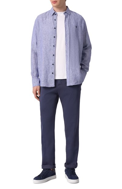 Для пошива рубашки с фигурным низом и воротником-стойкой использовали то нкую льняную ткань. На кокетке сзади – фирменная нашивка с прорезями.