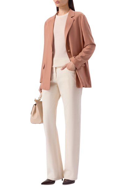 Лаконичный однобортный жакет с двумя карманами сшили из текстиля, получившей в марке название cashmere 4.0. Фирменная обработка сделала тонкую до полупрозрачности ткань из воздушного пуха высокогорных коз практически немнущейся. Для большей свободы движения модель дополнили сзади шлицей.