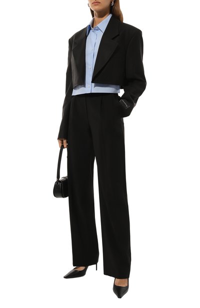 Прямые черные брюки с боковыми и прорезными задними карманами не будут противоречить офисному дресс-коду и удачно дополнят образ для вечернего выхода. Для пошива модели использовали тонкую ткань из мягкой сертифицированной шерсти и прочного переработанного полиэстера. Материал не подвержен пилингу и почти не мнется, поэтому изделие с отглаженными стрелками будет долго выглядеть безупречно.