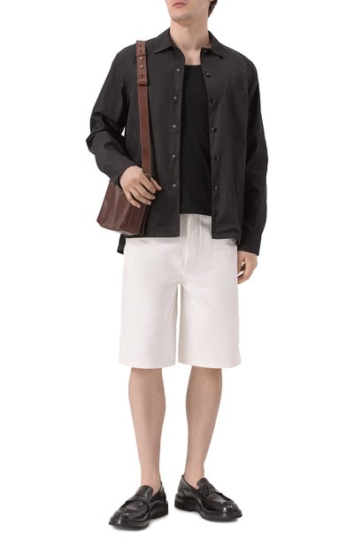 Шорты с отворотами и защипами на талии сшили из льняного габардина. Модель с регулируемым поясом-кулиской дополнили двумя боковыми и парой прорезных карманов сзади.
