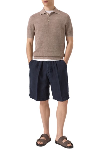 Сини е шорты с боковыми и задними карманами украсили лишь небольшими отворотами, поэтому модель выглядит лаконично. Для пошива изделия с регулируемым поясом-кулиской использовали тонкий лен, который поддерживает комфортный микроклимат. Волокна тщательно отобрали по толщине, чтобы материал получился более однородным и гладким.