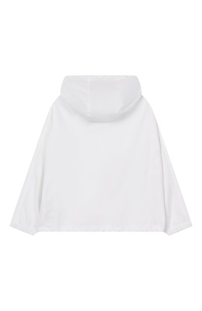 Бежевую ветровку выполнили из легкой непродуваемой тафты, в которой прочный полиэстер соединили с дышащим хлопком. Благодаря влагозащитному покрытию куртка защищает от небольшого дождя. Сохранить тепло помогают капюшон, эластичные манжеты и кулиска со шнуром вдоль низа. По бокам от встречной молнии есть цепочки мониль, пришитые вручную.