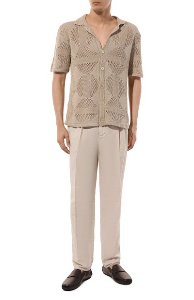 Светло-бежевые прямые брюки со стрелками делают менее формальными эластичный пояс-кулиска и неравномерная фактура материала. В ткани переплели скрученные волокна тонкого льна и мягкого хлопка, поэтому модель хорошо пропускает воздух, обеспечивая комфорт даже в знойный день.