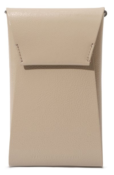 Бежевый чехол для iPhone напоминает небольшую сумку с плечевым ремнем из цепочек мониль. Для изготовления аксессуара с откидным клапаном использовали плотную кожу Sleek с зернистой фактурой, подчеркнутой глянцевой отделкой. Заднюю панель дополнили небольшим слотом.