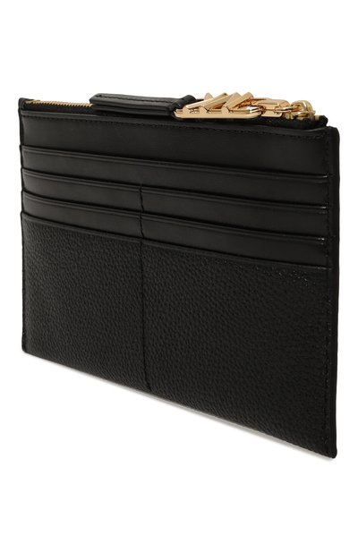Для создания голубого футляра использовали прочную зернистую кожу, которая не боится царапин и заломов. Аксессуар с шестью слотами для пластиковых карт дополнили отделением для банкнот, чеков и монет, застегивающимся молнией. Переднюю панель украсили золотистым металлическим логотипом бренда.