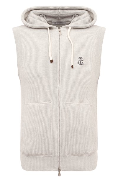 Светло-серый жилет с регулируемым капюшоном мастера марки, основанной Брунелло Кучинелли, выполнили фактурной вязкой из тонкого хлопка. Изделие из такого материала получилось теплым, но при этом дышащим и особенно приятным на ощупь, поэтому в нем будет комфортно весь день. Модель с двумя крупными накладными карманами спереди украсили небольшой эмблемой бренда.