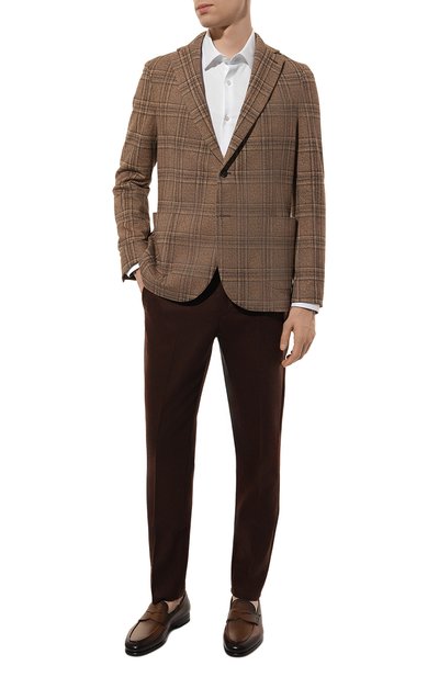 Коричневый пиджак в крупную клетку сшили из тонкой шерстяной ткани с добавлением легкого бамбука, гладкого шелка и прочного льна. Дышащий материал и облегченная конструкция без подклада делают модель с прямоугольными лацканами и тремя карманами подходящей для теплого времени года. В петлице — знаковая булавка в виде наперстка.
