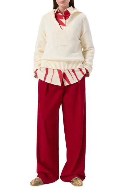 В исполнении Доротеи Шумахер свободная блуза с длинными расклешенными рукавами выглядит особенно ярко. Для пошива модели использовали струящийся шелковый атлас с разноцветным абстрактным принтом Rainbow flames, напоминающим разводы акварельной краски. Каплевидный вырез на круглой горловине дополнили тонкими завязками.