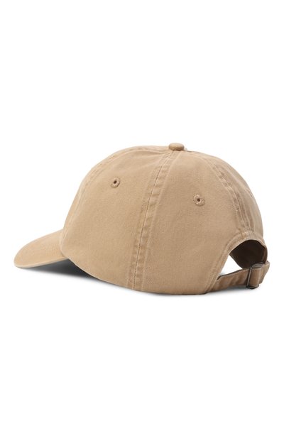 Для изготовления светло-бежевой бейсболки с изогнутым козырьком использовали плотный хлопковый твил, который не требует сложного ухода. Пористая структура волокон помогает материалу пропускать воздух. Спереди изделие украсили неоново-желтым принтом с черным логотипом бренда.