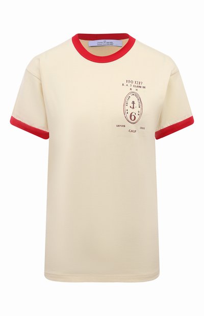 Для пошива футболки молочного оттенка использовали мягкое хлопковое джерси. Материал хорошо пропускает воздух, поэтому модель с красным кантом на горловине и манжетах поддерживает комфортный микроклимат. Спереди нанесли небольшой принт в морской тематике и повторили его в увеличенном размере сзади.