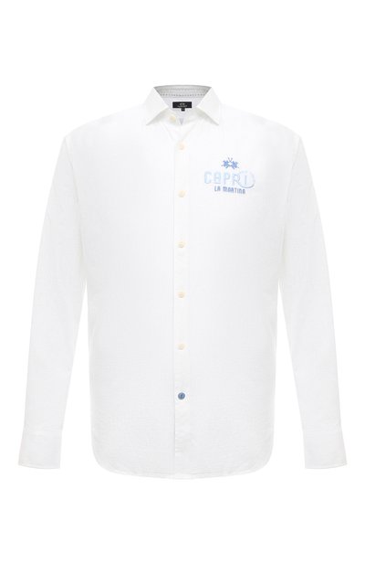 Белая рубашка с длинными рукавами подойдет, чтобы отметить очередной температурный рекорд. Для пошива модели использовали тонкую легкую ткань из отборного хлопка и прочного льна, которая отлично пропускает воздух, быстро отводит влагу и не впитывает запахи. Спереди изделие украсили голубой вышивкой в виде эмблемы, логотипа и надписи Capri.