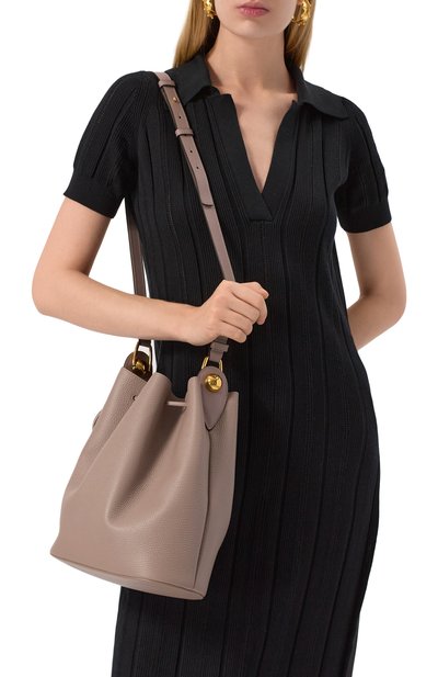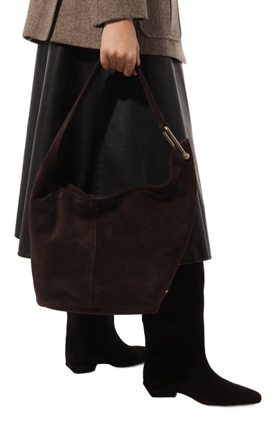 Для изготовления прямоугольной сумки оттенка хаки использовали прочную замшу. Тщательная выделка сделала бархатистый материал мягким и пластичным и придала цвету уникальный подтон. Широкий ремень регулируется по длине, поэтому аксессуар комфортно носить в руке, на сгибе локтя или на плече. В модель с тисненой эмблемой на передней панели поместятся кошелек, бумаги формата А4, смартфон и зонт.