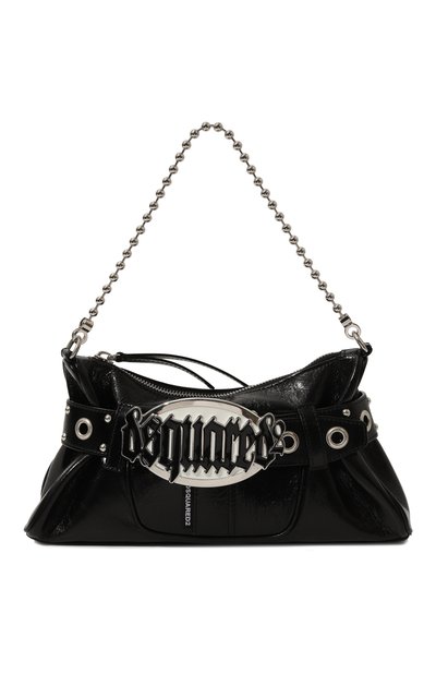 Сумка Gothic из мятой глянцевой кожи легко перетянет на себя внимание в образе. Главной ее деталью сделали крупную пряжку с логотипом в готическом стиле, дополняющую декоративный пояс. Его украсили заклепками и люверсами, а повторили их расположение на коротком плечевом ремне. Изделие дополнили цепочкой из серебристых шаров, которая может сыграть роль ручки. В аксессуар поместятся кошелек, телефон, ключи и флакон духов.