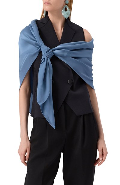 Шаль с градиентным волнистым принтом, создающим эффект оптической иллюзии, изготовили из нежного струящегося шелка. Тонкий материал не вытягивается со временем, красиво драпируется и быстро расправляется после узла, не образуя заломов. Наши стилисты предлагают превратить аксессуар в эффектный кроп-топ.