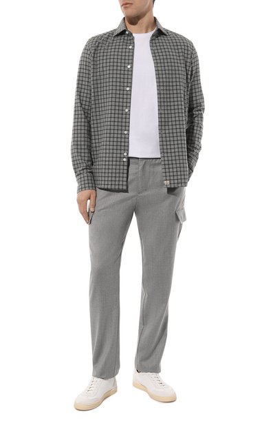 Прямые серые брюки подойдут тем, кто не обременен строгим офисным дресс-кодом. Для пошива модели с широким регулируемым поясом-кулиской использовали мягкую ткань из премиальной шерсти первого пострига. Материал с тончайшими упругими волокнами, в гладкости не уступающими шелку, поддерживает оптимальный микроклимат, не подвержен пилингу и почти не мнется. Над одним из прорезных задних карманов изделие украсили логотипом из ювелирного сплава с рутениевым покрытием.