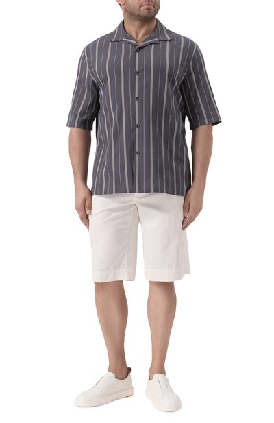 Свободные кремовые шорты с трикотажной полосатой вставкой на поясе сзади станут удачным пополнением базового летнего гардероба. Для изготовления модели использовали тонкую льняную ткань с добавлением шелка, хорошо пропускающую воздух и обладающую легким охлаждающим эффектом. Изделие дополнено тремя парами карманов: врезными боковыми, карго на брючинах и задними накладными, один из которых украшен вышивкой ZILLI Signature.