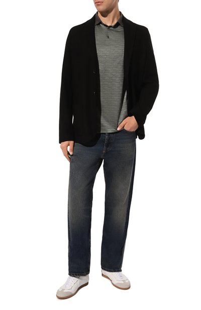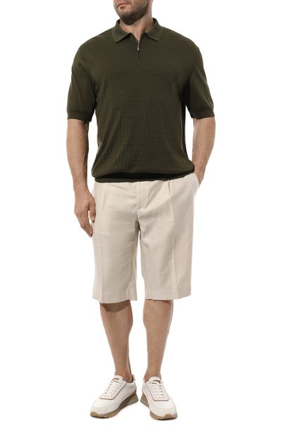 Поло оттенка хаки станет основой повседневного образа с брюками или джинсами. Модель изготовили из мягкого шелкового трикотажа с добавлением легкого хлопка, поэтому она идеально пропускает воздух, не пилингуется и не вытягивается со временем. Гладкие нити хорошо отражают свет, придавая жаккардовому узору спереди ос обую рельефность.