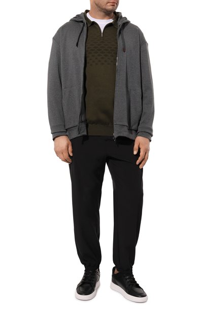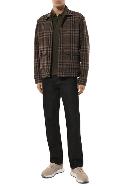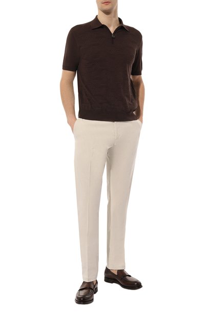 Поло оттенка хаки станет основой повседневного образа с брюками или джинсами. Модель изготовили из мягкого шелкового трикотажа с добавлением легкого хлопка, поэтому она идеально пропускает воздух, не пилингуется и не вытягивается со временем. Гладкие нити хорошо отражают свет, придавая жаккардовому узору спереди особую рельефность.