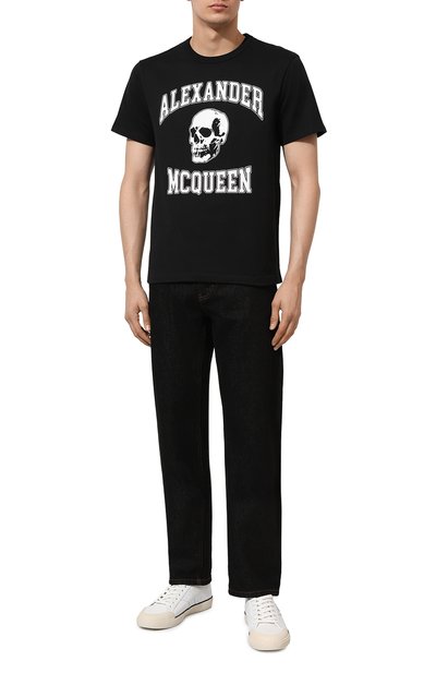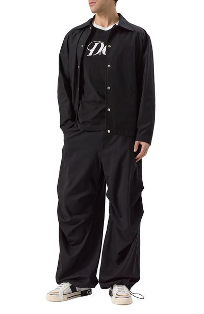 Черная футболка громко заявляет о своей принадлежности бренду: спереди ее украсили крупной контрастной вышивкой в виде логотипа, дополненной сверкающими кристаллами. Для пошива модели со спущенной линией плеч использовали мягкое джерси из отборного хлопка. У него длинные, прочные и гладкие, как шелк, волокна, поэтому изделие долго не потеряет изначальный вид.