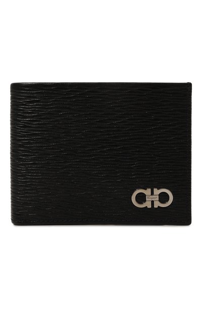 Черное портмоне состоит из двух отсеков для купюр, двух отделений, в которых удобно хранить чеки, и шести слотов для кредитных карт. Для пошива аксессуара двойного сложения использовали тисненую телячью кожу, фактуру которой подчеркнули легким блеском. Переднюю панель украсили серебристой эмблемой Gancini.