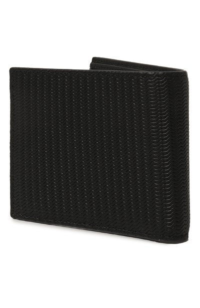 Черное портмоне состоит из двух отсеков для купюр, двух отделений, в которых удобно хранить чеки, и шести слотов для кредитных карт. Для пошива аксессуара двойного сложения использовали тисненую телячью кожу, фактуру которой подчеркнули легким блеском. Переднюю панель украсили серебристой эмблемой Gancini.