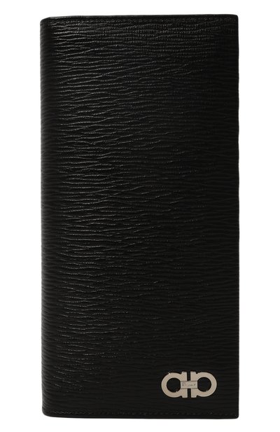 Черное портмоне выполнили из мягкой кожи с фактурным муаровым тиснением. В аксессуаре с гладкой внутренней отделкой предусмотрели 16 слотов для банковских карт, три отделения для купюр и карман для монет, закрывающийся молнией. Переднюю панель украсили крупной серебристой пряжкой Gancini из полированного металла.