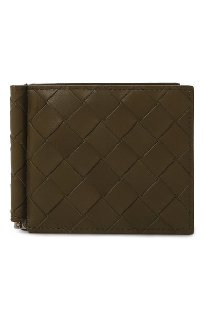 Аксессуар оттенка хаки выполнили вручную в фирменной технике плетения intrecciato из узких полос тонко выделанной мягкой кожи. В основном отделении с гладкой отделкой из такого же материала предусмотрели сере бристый металлический зажим для купюр и шесть слотов для банковских карт.