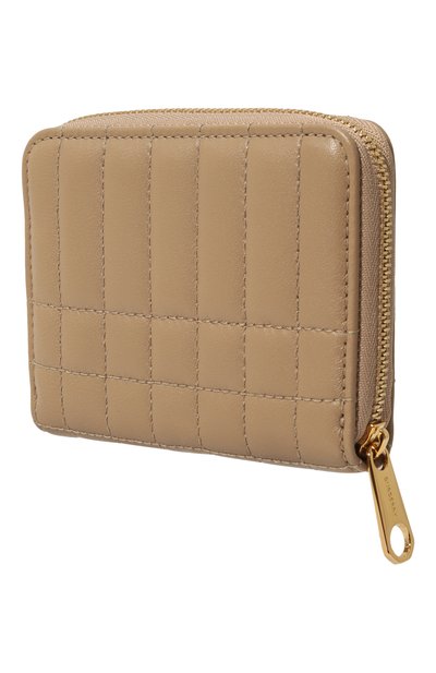 Коричневое портмоне из линии Lola сшили из особенно мягкой кожи ручной выделки. Аксессуар со стеганным узором, вдохновленным знаковой клеткой, украсили золотистой накладкой в виде монограммы из инициалов Томаса Берберри. Модель со слотами для банковских карт и отделениями для купюр и чеков застегивается круговой молнией.