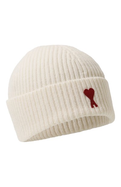 Красный патч в виде эмблемы марки подчеркивает широкий отворот на этой шапке бини из белой шерсти. Пряжу выполнили из руна ягнят, которых вырастили в условиях, близких к естественным, и остригли, не причиняя вреда. Чтобы аксессуар хорошо тянулся, его связали в технике резинки.