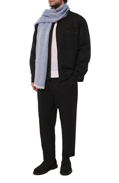 Синий шарф получился максимально лаконичным. Единственный декор — короткая бахрома по краям. Широкий длинный аксессуар выполнили из тонкого модала, который делает изделие почти невесомым. Шелковистая ткань хорошо пропускает воздух, не создавая парниковый эффект.