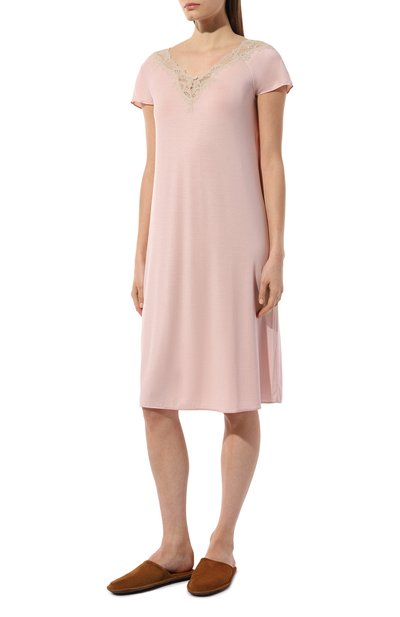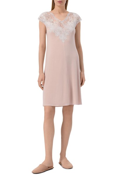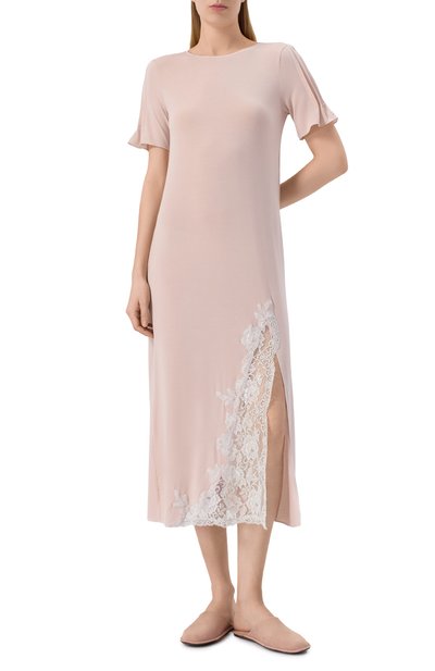 Для пошива короткой сорочки пудрового оттенка использовали тонкое эластичное джерси на о снове шелковистого модала. Легкий материал не электризуется, пропускает воздух лучше хлопка и обладает терморегулирующими свойствами, поэтому в изделии будет комфортно во время сна и домашнего отдыха. Модель без рукавов, с глубоким круглым вырезом декорировали на подоле фигурной вставкой из ажурного цветочного кружева Leavers ручной работы.