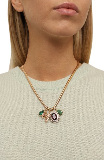 Колье в виде двух цепочек панцирного плетения, незначительно различающихся по длине, изготовили из прочного ювелирного сплава с гальваническим покрытием золотом. Из такого же металла выполнили подвески в форме крестов с выгравированными логотипами марки. Длинное украшение с миниатюрным связующим кольцом оставили без застежки.