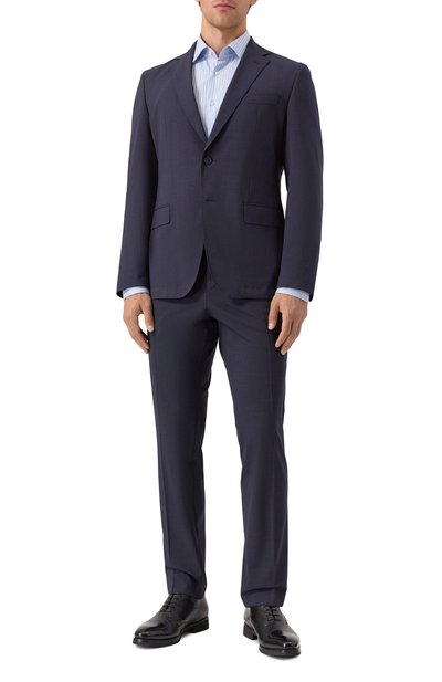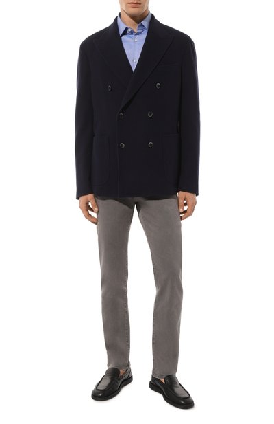 Голубую сорочку с воротником кент сшили из тонкого гладкого хлопка поплина. Дышащий материал обработали по технологии Easy Iron, поэтому модель силуэта Slim fit почти не мнется и легко гладится после стирки. Образ с таким изделием получится менее формальным, если расстегнуть верхние пуговицы, чтобы продемонстрировать разноцветный кант по краю планки.